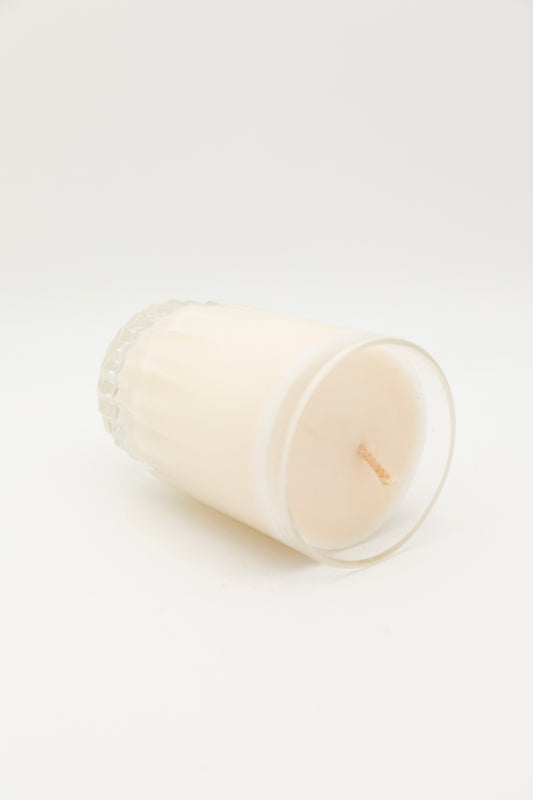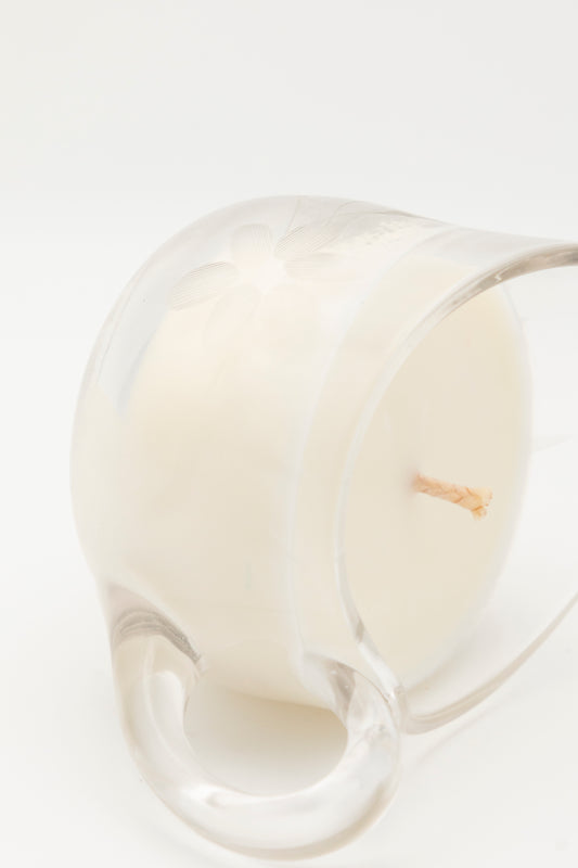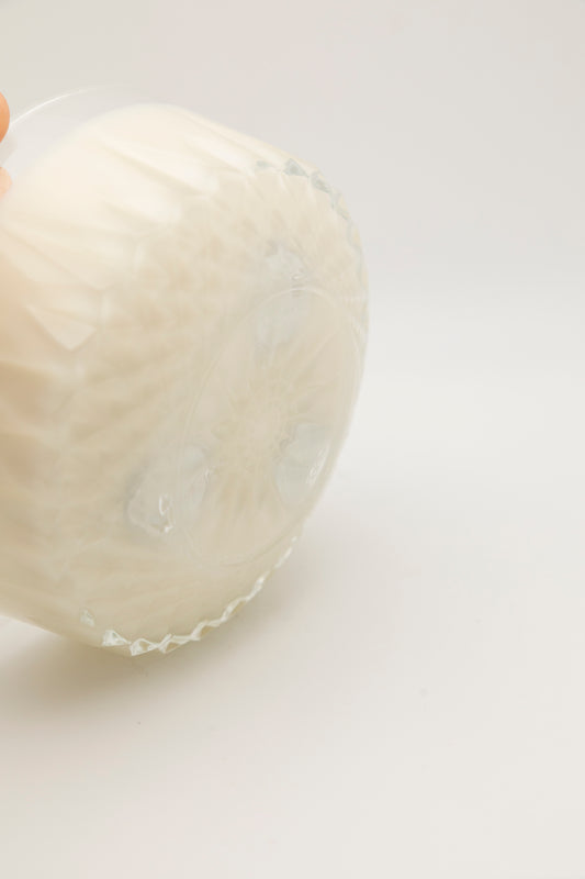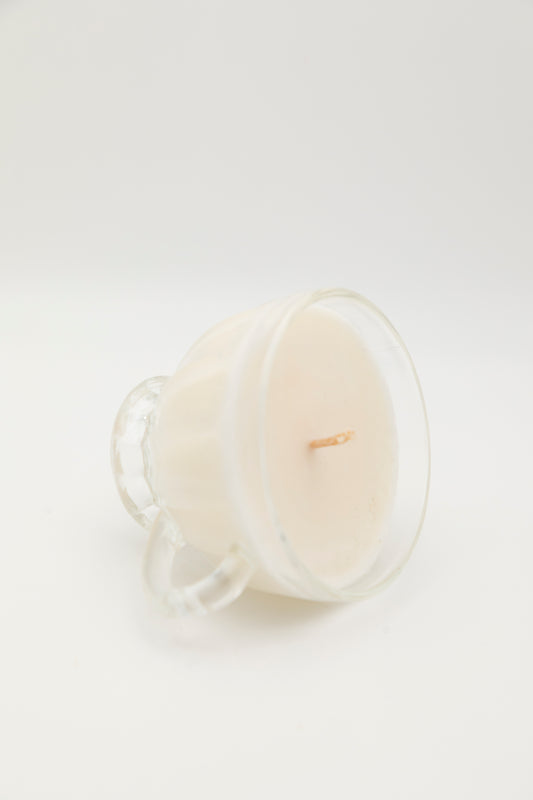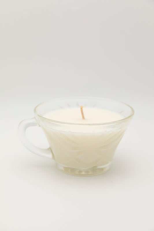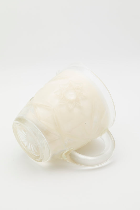 small glass teacup with line design