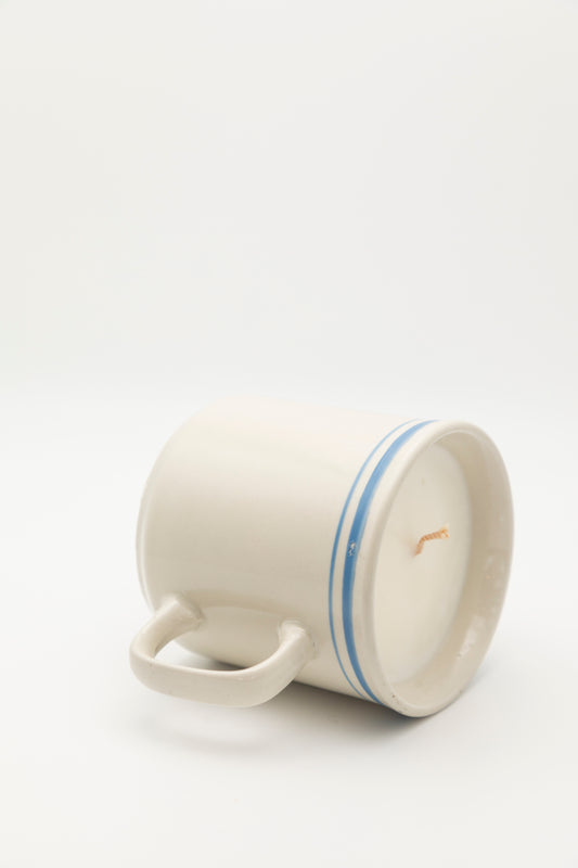 farmhouse style mug with blue rim